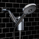 Moonlight Shower head with handheld shower attachment against a black tiled wall